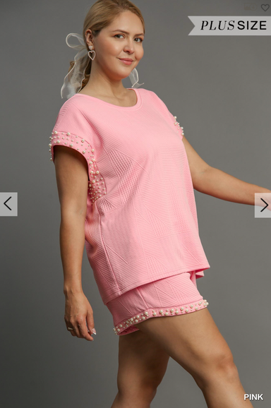 Our Claire Pearl Two Piece Set is what dreams are made of! Features a boxy cut top with pearl detailing, jacquard textured fabric, + pairs perfectl...
