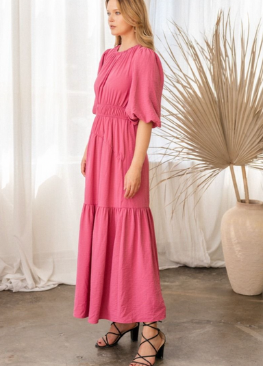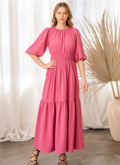 Our Mila Puff Sleeve Dress is just what you need! Features 3/4 puff sleeves, waist and neckline smocking, solid color, tiered style, and woven mate...