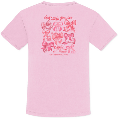 View full detailsA charming reminder of God’s love and your unique beauty. This soft blossom-colored tee features a “God Says You Are Bows” graphic, celebrating fai...