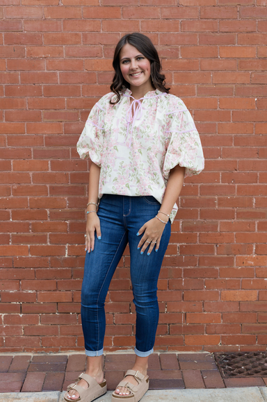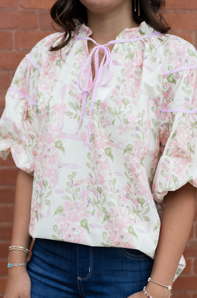 Your next go-to girly top! With a hydrangea-inspired print, bubble sleeves, and a flirty tie-front, this piece is perfect for everything from brunc...