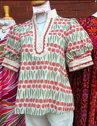 View full detailsYour new fall fave is here! This short sleeve top features the prettiest scallop detailing and the perfect seasonal print. Easy to style and effort...