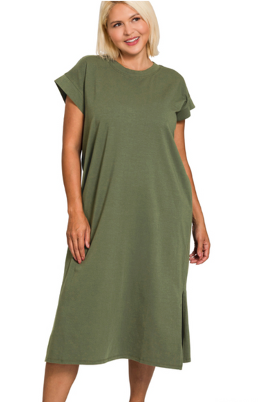 View full detailsYour new go-to midi dress! Made in a soft + stretchy cotton blend, this dress keeps you comfy while looking put together. The round neckline and sh...