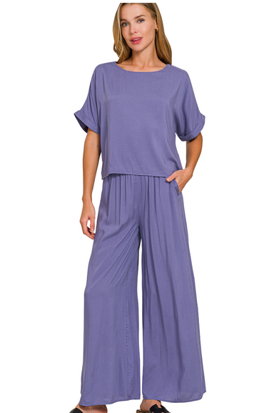 Meet your new matching moment ✨ This woven set features a relaxed-fit short sleeve top with drop shoulders and coordinating long pants with an elas...