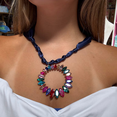 This navy scarf necklace brings luxe vibes with its rich color and standout gemstone circle pendant. Self-tie styling lets you customize your look,...